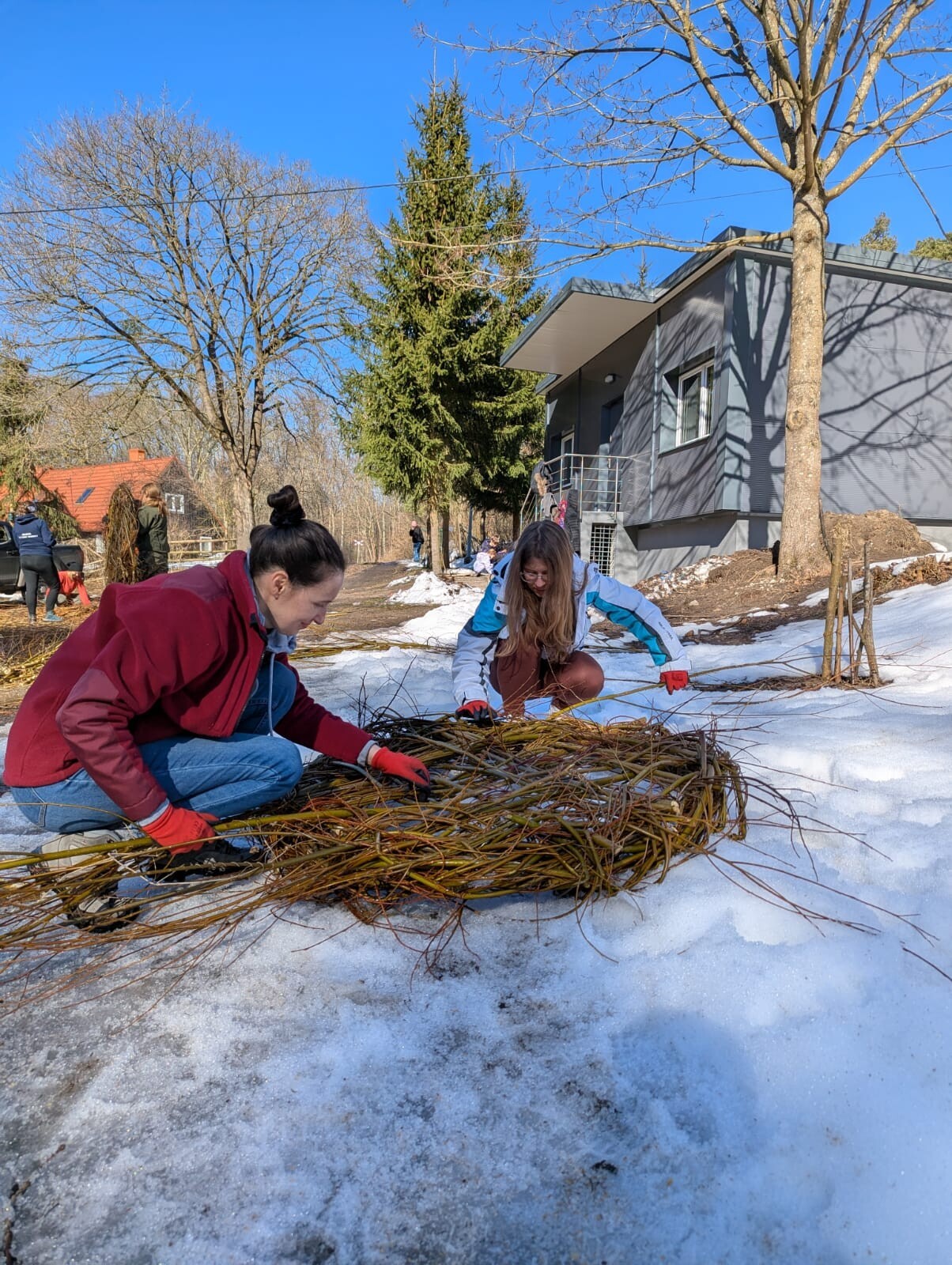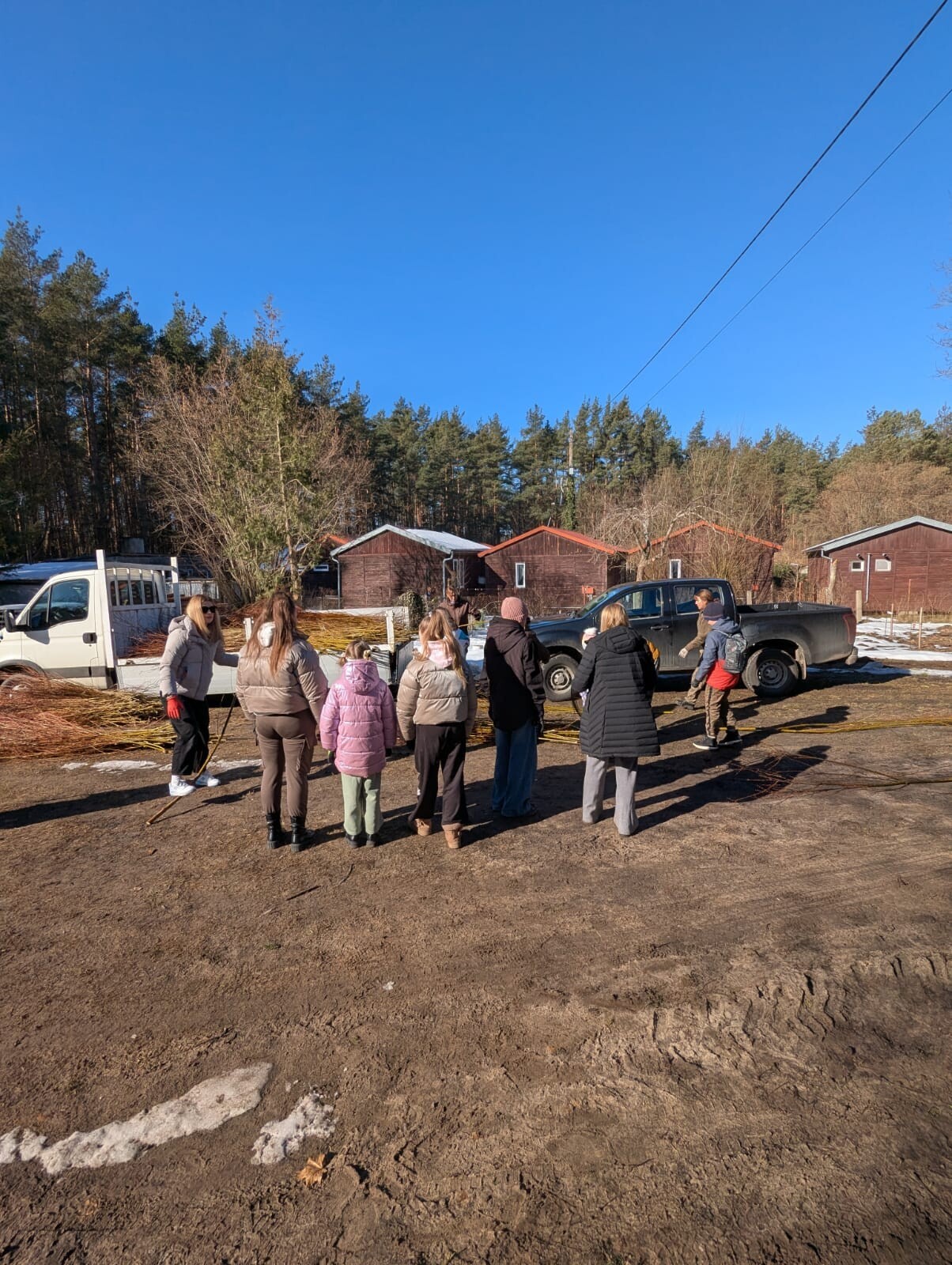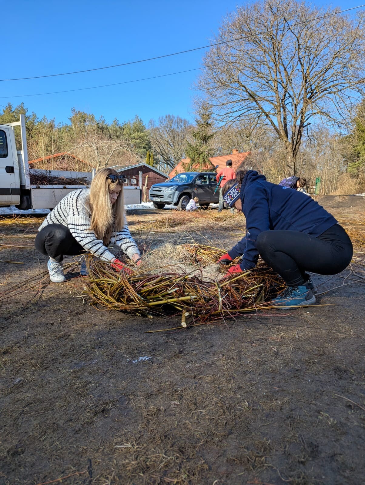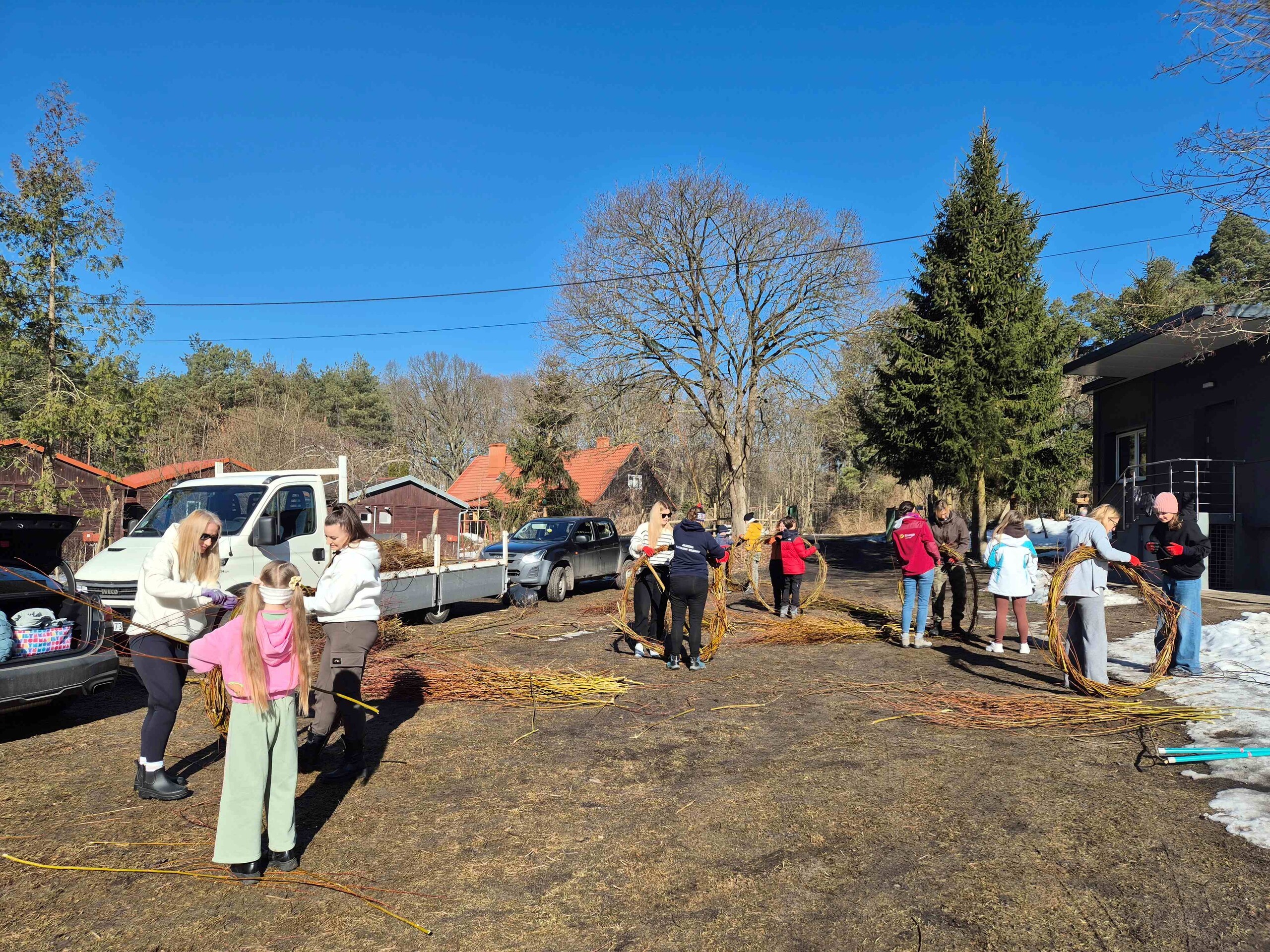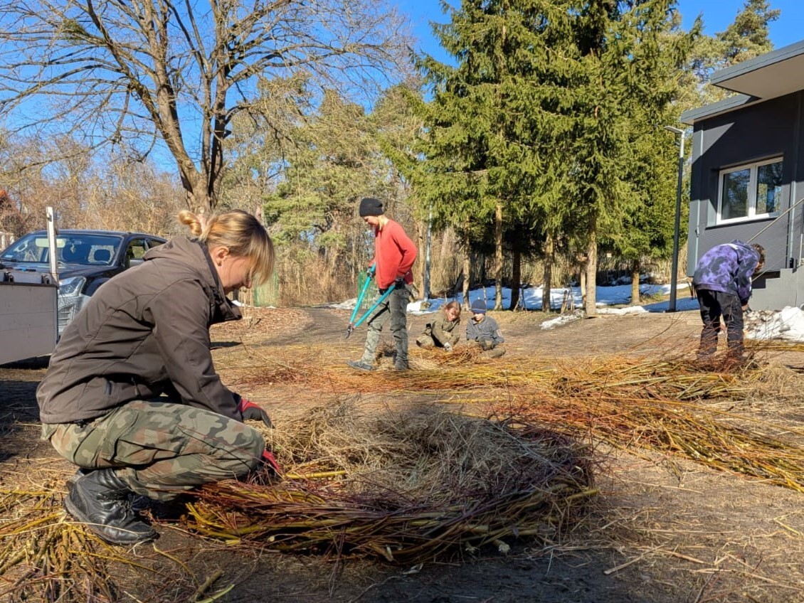 Materiał do wyplatania podstaw pozyskaliśmy wraz z pracownikami Urzędu Morskiego w Gdyni z Obwodu Ochrony Wybrzeża w Sztutowie, którzy przewieźli go na teren swojej placówki. Po krótkiej pogadance i omówieniu zasad bezpieczeństwa 6 zespołów przystąpiło do pracy. W efekcie podczas warsztatów wypleciono 6 podstaw, które w najbliższym czasie trafią na słupy energetyczne.