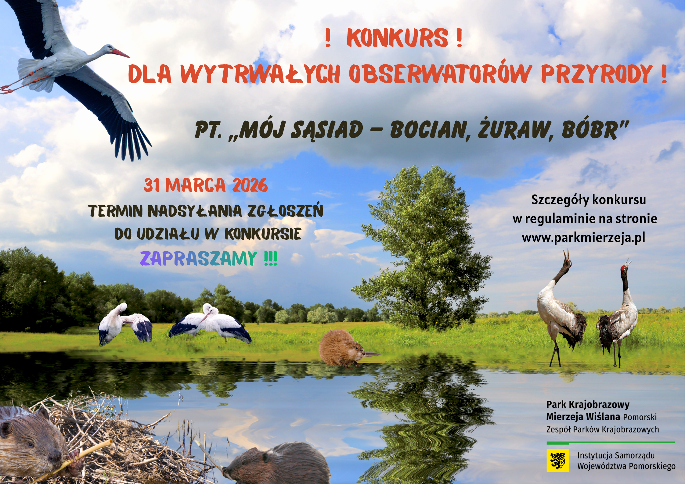 Lubisz obserwować przyrodę i spędzać czas na świeżym powietrzu! Interesują Cię zwierzęta i ich behawior? Mamy dla Ciebie ciekawą ofertę - zapraszamy do udziału w konkursie o charakterze badawczym zatytułowanym: „Mój sąsiad – bocian, żuraw, bóbr”. Konkurs ma za zadanie zwrócić uwagę na coraz trudniejsze warunki bytowania zwierząt.